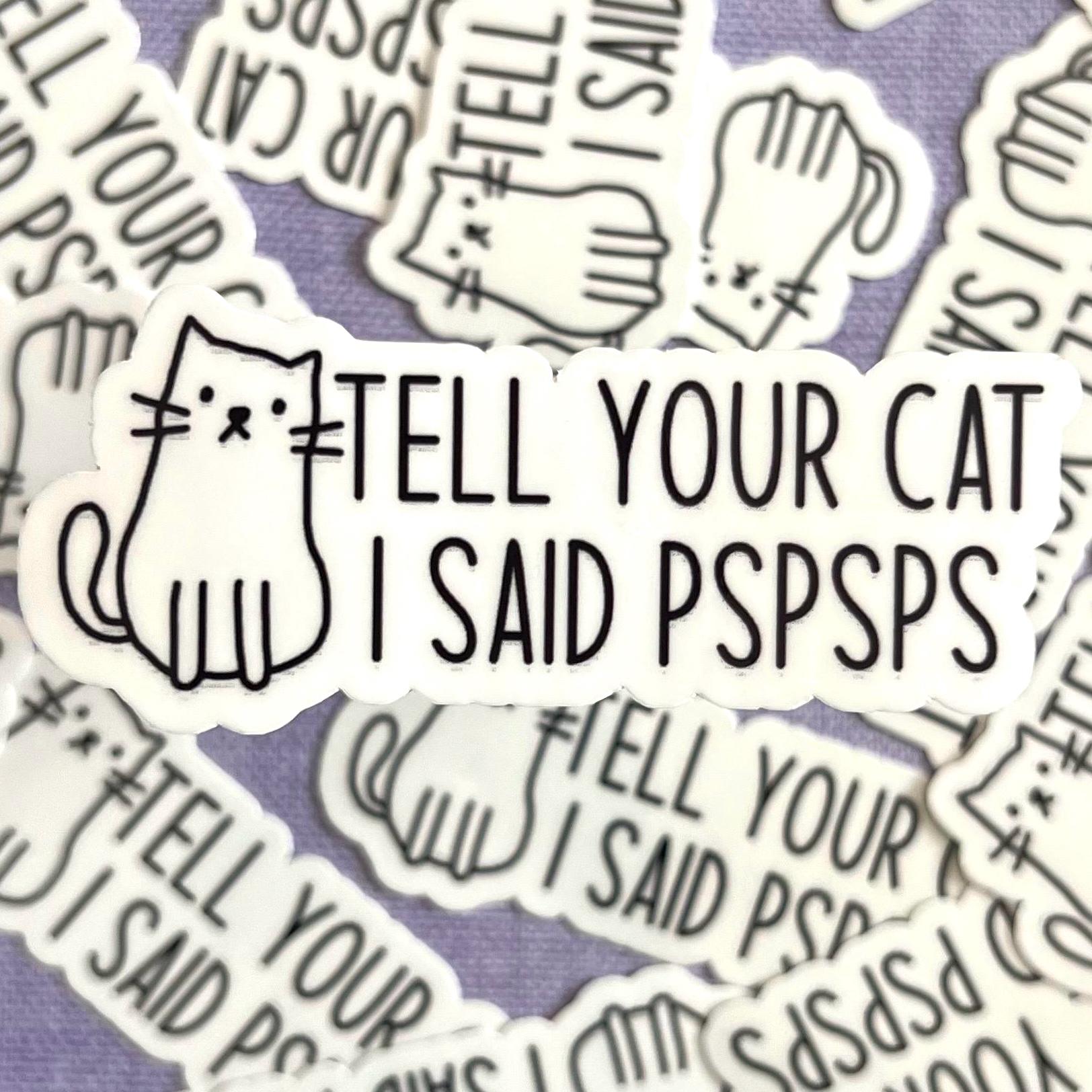 Who doesn't love showering their feline friends with affection? This playful Tell Your Cat I Said PSPSPS 1.2" x 3" sticker lets you publicly declare your adoration for your cat, while also speaking the secret language all cat owners understand. Stick it on your laptop, water bottle, or surface to let the world know your cat is the true boss. Your kitty will appreciate the recognition, and you'll get a smile every time you catch a glimpse of this charming design.
